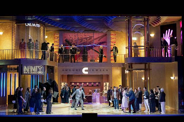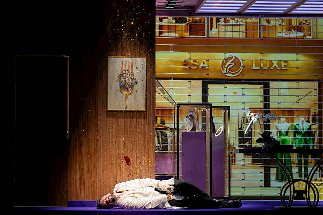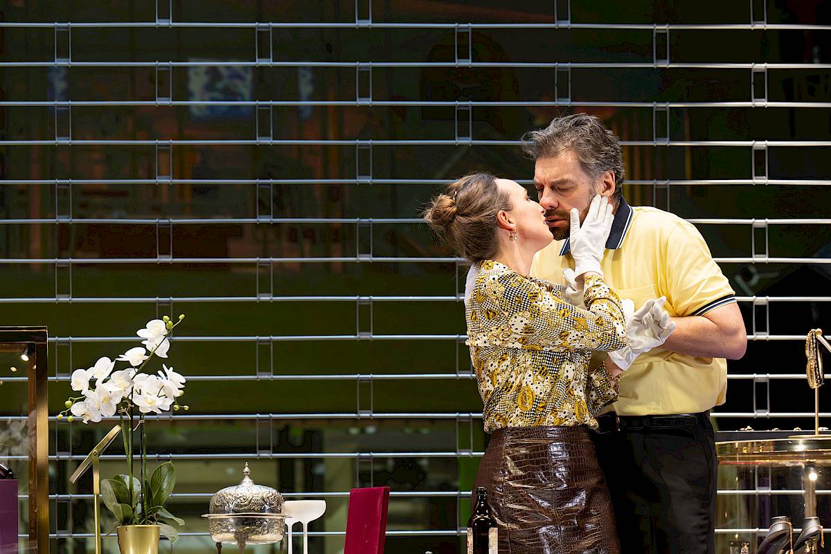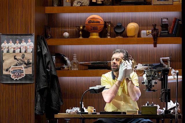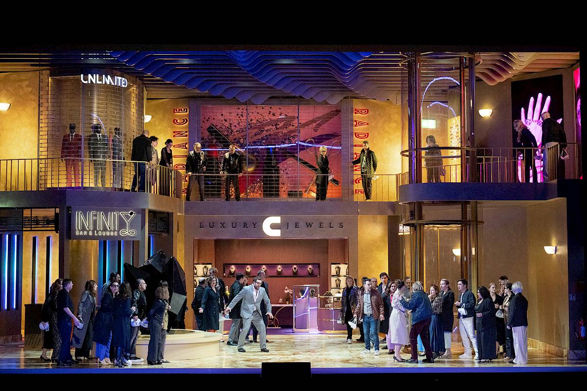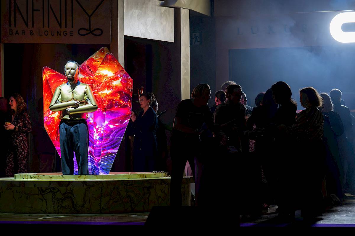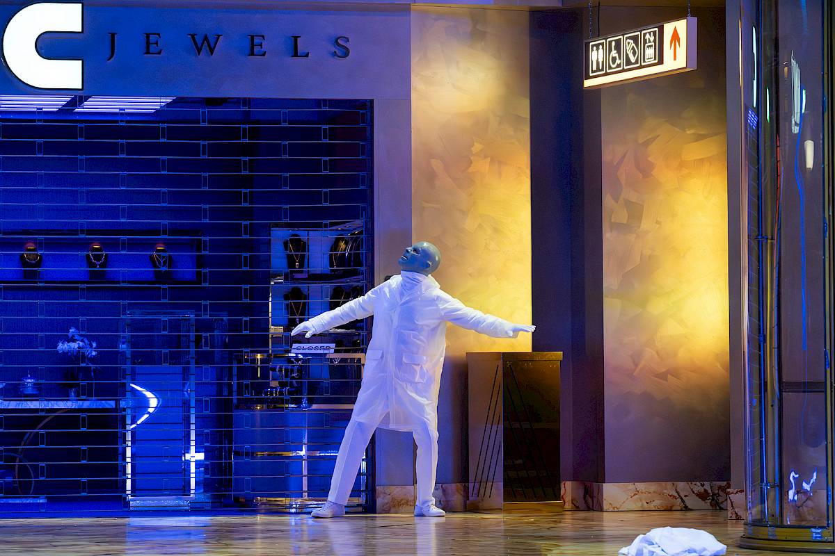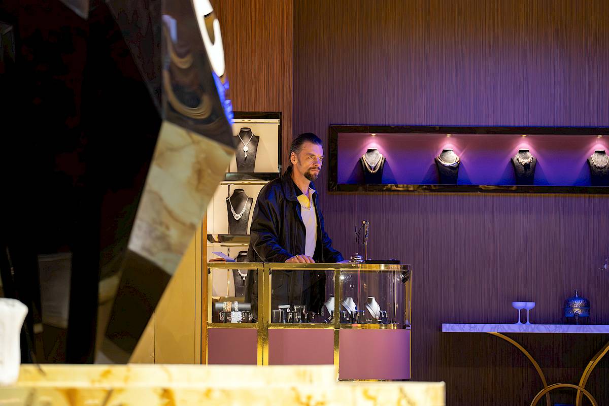 The visual inspiration for the set comes from real urban locations, from New York’s Diamond District to Antwerp, where gold and diamonds function as “the fuel of wealth”. This glittering world contrasts sharply with the psychological darkness of the drama, a play between shimmering surface and inner abyss.