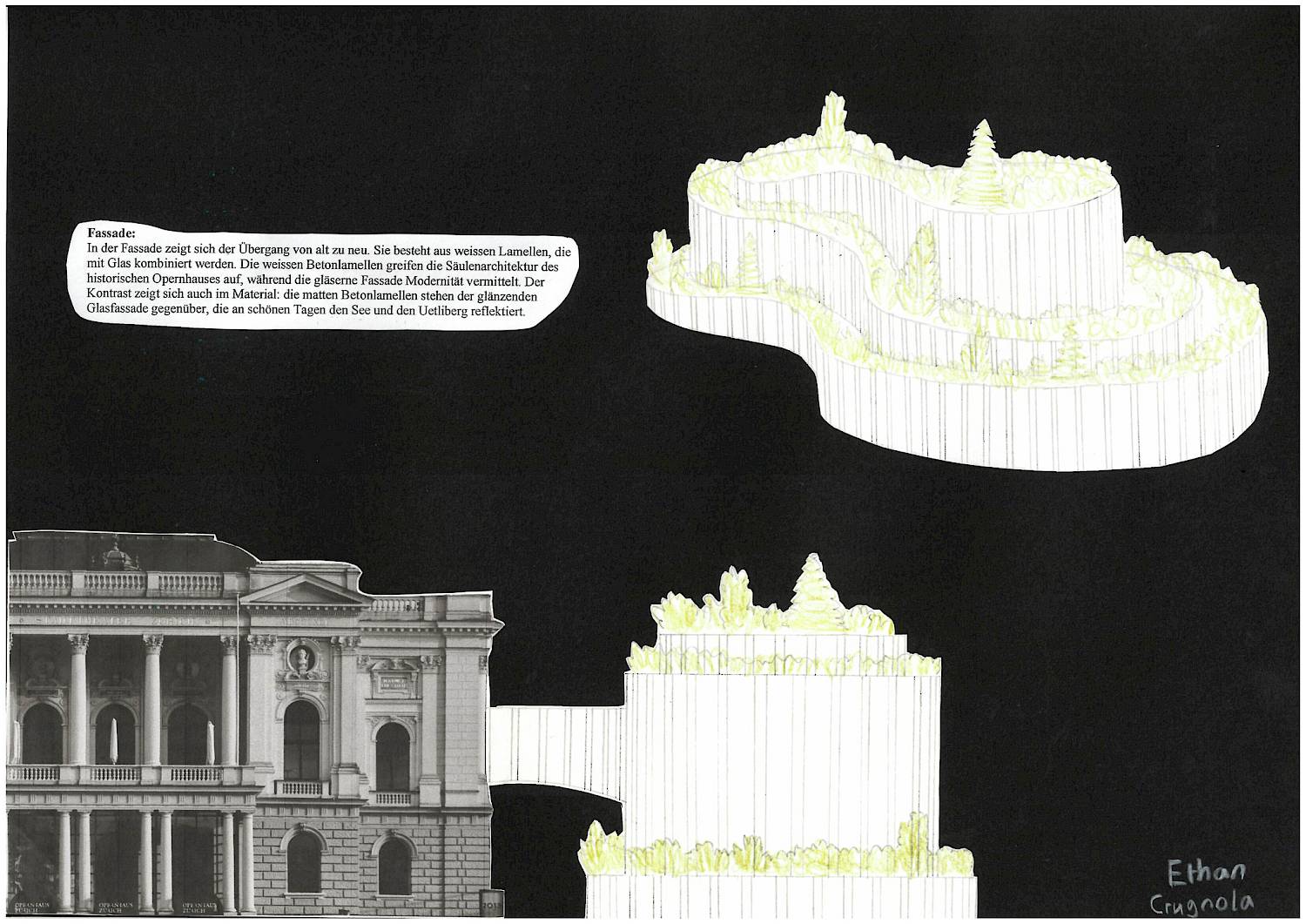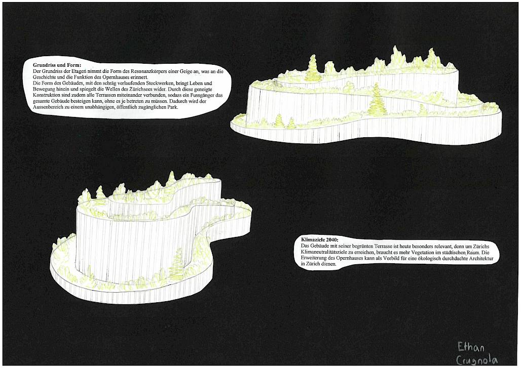 Nach dem Opernhaus-Besuch entstanden direkt erste Skizzen, um eine Grundidee zu finden. Als ich nach vielen Zeichnungen und Recherchen eine ungefähre Vorstellung des Gebäudes hatte, verfeinerte ich das Projekt im Workshop, zum Beispiel bei der Materialwahl. Dabei habe ich das Umfeld des Gebäudes berücksichtigt, wie den See, das Opernhaus und die Sicht auf den Uetliberg. Danach erstellte ich 3D-Modelle auf dem Computer, und auf Grundlage dieser vereinfachten Modelle habe ich schlussendlich die endgültigen Zeichnungen angefertigt.