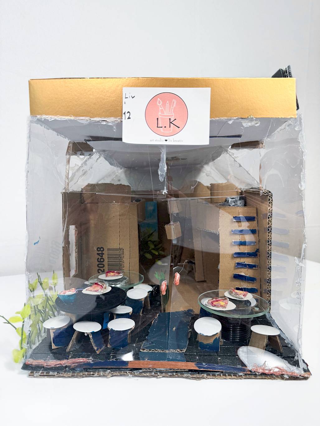 Natur...Natur war für mich, sehr wichtig, um eine gemütliche Einrichtung zu schaffen. Es beruhigt in gewisser Weise und lässt alles natürlicher wirken. Ausserdem hat es einen guten Kontrast zum Licht. Ich würde mich als sehr kreativen Menschen bezeichnen, daher auch den Platz, um zu zeichnen (kreativ sein). Allerdings lese ich auch gerne. Ich wollte das kombinieren. Es ist für mich der Teil der am besten Restaurant (Regeln) und zuhause (Entspannung) verbindet. Entspannung: man kann es sich gemütlich machen, lesen und muss nicht aufrecht sitzen... Restaurant: Man ist bedient, in der Öffentlichkeit.... ich habe an manchen Stellen der Säulen, den oberen Rand verlängert, um sich anlehnen zu können. Ich habe bewusst Glas genommen. Es soll offen wirken, sorgt für Licht und man kann beobachten was draussen geschieht. Besonders wenn man lange dort ist, kann das spannend sein. Ich habe gezielt Bodenplatten (Fliesen) eingebaut um den (klassischen) Restaurantbereich vom restlichen Areal abzutrennen. Jedoch habe ich trotz dem vorgesehen das man in den Säulen trinken und essen darf (nicht bedient). Die Glastische geben einen schönen Kontrast zu den Scheiben. Auf dem Dach kann man schöne Sonnenunter/Aufgänge sehen. Es hatte nur Platz für eine Launch. In meiner Vision gibt es jedoch genug Platz für alle auf dem Dach. Die Bühne, ich dachte es ist nichts authentischer als eine echte Kulisse. In meiner Vorstellung kann man die schwarze Kulisse wegnehmen und dann befindet sich ein schöner Zürichsee dahinter. Ich habe viel über Glas geschrieben, doch ich habe eine grosse Lampe für die Halle gebaut und kleine Schreibtischlampen. Ich will eine gemütliche Stimmung erreichen deshalb, aber das konnte ich nicht darstellen, haben alle Lampen nur warmes Licht.»