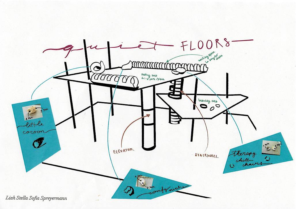 Auch zwei Reihen an einzelnen, abgeschirmten Pulten kannst du da finden, falls du vielleicht doch noch etwas für die Schule oder für die Arbeit erledigen musst, aber die Unibibliotheken beispielsweise zu weit weg oder zu voll sind. Und die Steckdosen dürfen natürlich nicht fehlen - die Arbeitsplätze sind voll ausgestattet, gleichzeitig reizarm und ästhetisch, um eine möglichst angenehme und produktive Arbeitsatmosphäre zu schaffen.