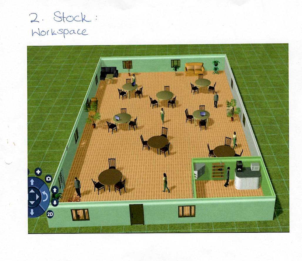 «Im Eingangsbereich befindet sich ein moderner Glassaufzug. Um den Aufzug herum windet sich eine elegante Wendeltreppe. Um den Lift herum hängen grüne Pflanzen, die Wände sind in einer hellgrünen Farbe gestrichen. Zusammen mit dem modernen Glaslift entsteht so ein offener und einladender Eingangsbereich. Der zweite Stock stellt einen Lern- und Arbeitsraum dar. Es befinden sich mehrere Sofas und Sitzgelegenheiten im Raum. Es gibt eine Küche, in der man sich gratis einen Kaffee oder Tee machen kann. Im dritten Stock gibt es zwei Räume, einen Art Room und einen Chill-/Spiel-Raum. Die beiden Räume sind voneinander abgetrennt, sodass man in Ruhe und ungestört arbeiten, spielen oder kreativ sein kann.»