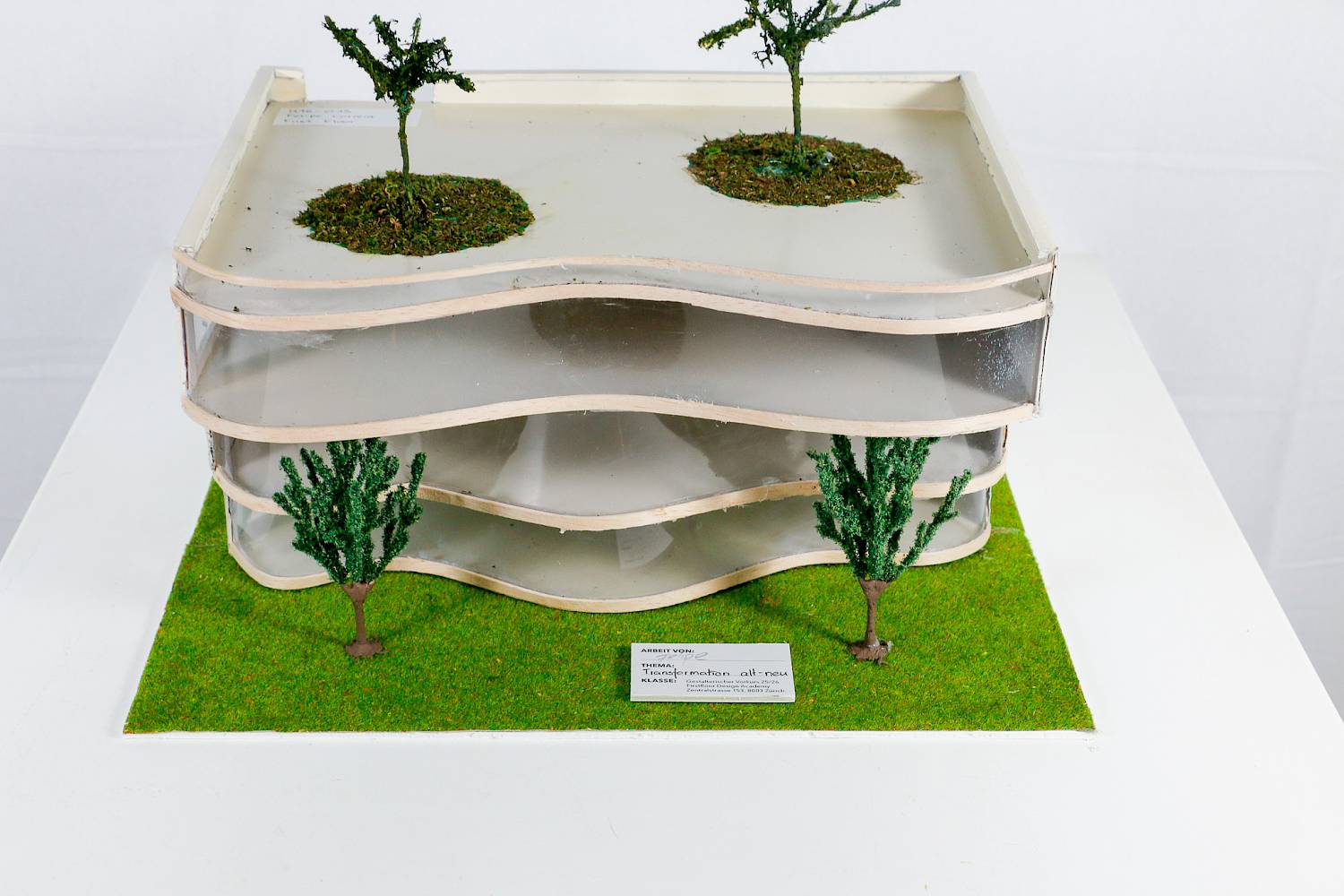 «Bei meinem Projekt OFFENHAUS war mir von Anfang an wichtig, einen Ort zu schaffen, der offen für alle ist. Nicht nur architektonisch, sondern auch in der Nutzung. Das Gebäude sollte ein Ort für Spass sein, aber gleichzeitig auch ein Ort für wichtige und konzentrierte Tätigkeiten. OFFENHAUS soll ein Treffpunkt sein, der für unterschiedliche Bedürfnisse funktioniert und trotzdem als zusammenhängendes Gebäude wahrgenommen wird. Es ist Stock für Stock unterschiedlich genutzt, damit es für möglichst viele Menschen etwas bietet. Im untersten Stock befindet sich der Trainingsraum für Tänzer, Ballerinas oder auch Theaterleute. Dieser Raum ist offen und grosszügig gestaltet, damit Bewegung und Kreativität Platz haben. Besonders wichtig war mir hier die grosse Glasfront. Für mich symbolisiert sie den Zürichsee —- durch die Klarheit des Materials und die Lichtreflexionen, die an Wellen erinnern. Zusätzlich dient die Glasfront im untersten Stock auch als Zuschauerbereich, sodass Passanten von aussen Einblick in das Training haben. Im zweiten Stock befindet sich der Bürostock. Mir war wichtig, dass dieser Stock ruhiger wirkt als die anderen. Dann kommen wir zu meinem Lieblingsstock, dem Essbereich. Der Essbereich ist aufgebaut mit ganz vielen verschiedenen Nationen, Essensrichtungen und unterschiedlichen Arten von Essen. Von Fast Food bis zu noblen Menüs hat es alles. Ganz oben befindet sich das Dach, das als Aufenthalts- und Begegnungsraum gedacht ist. Auf dem Dach stehen Bäume, die dem Ort Ruhe und eine natürliche Atmosphäre geben und so platziert sind, dass schattige Zonen entstehen. Von dort aus hat man einen Blick auf den Zürichsee, auf das Opernhaus und den Sechseläutenplatz. Eine Brücke verbindet das Dach mit dem Opernhaus, was den Austausch zwischen den beiden Gebäuden stärkt. Zusammengefasst verbindet OFFENHAUS Bewegung, Arbeit, Essen und Aufenthalt in einem offenen, lichtdurchfluteten Bau.»
