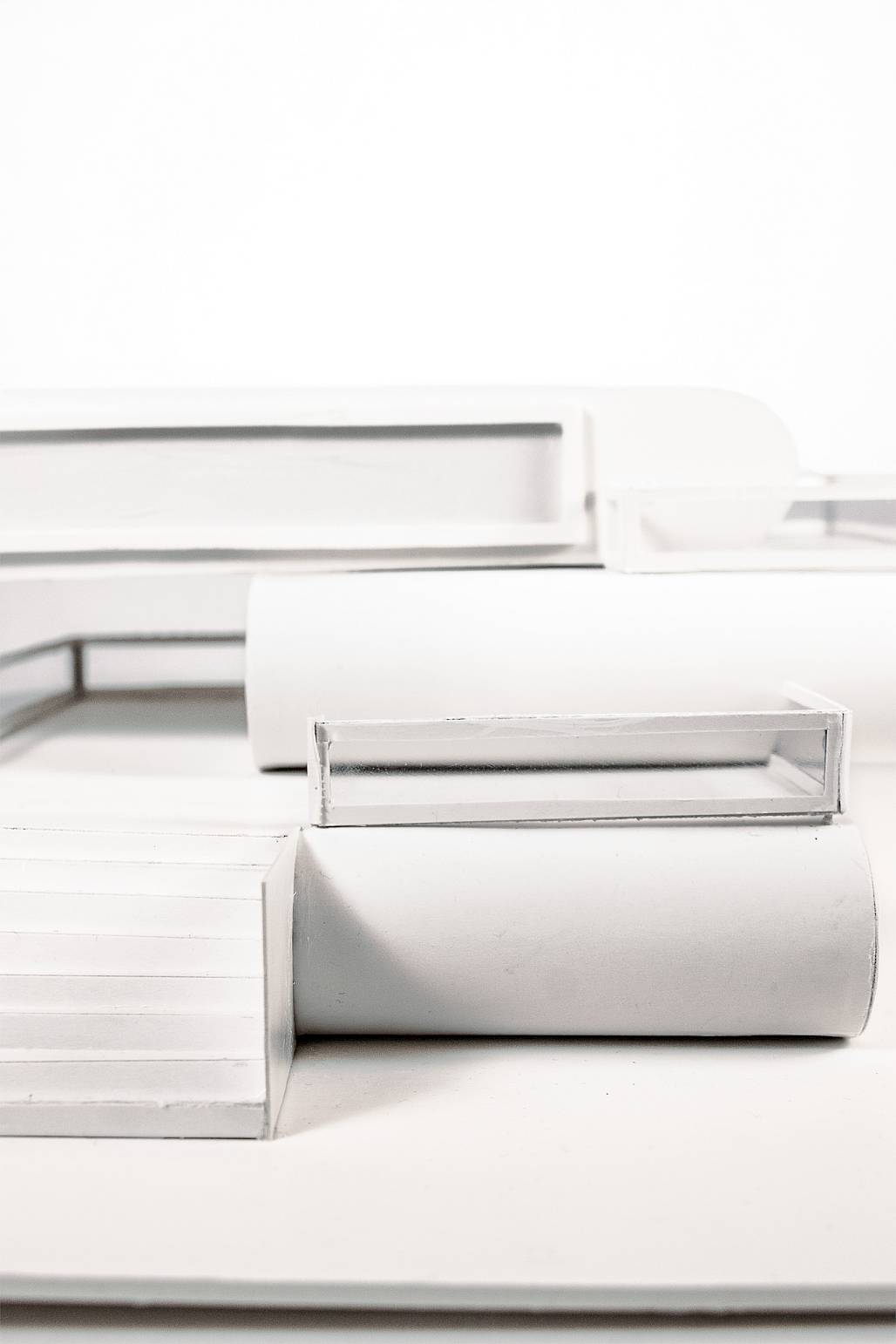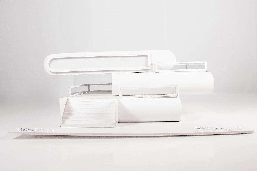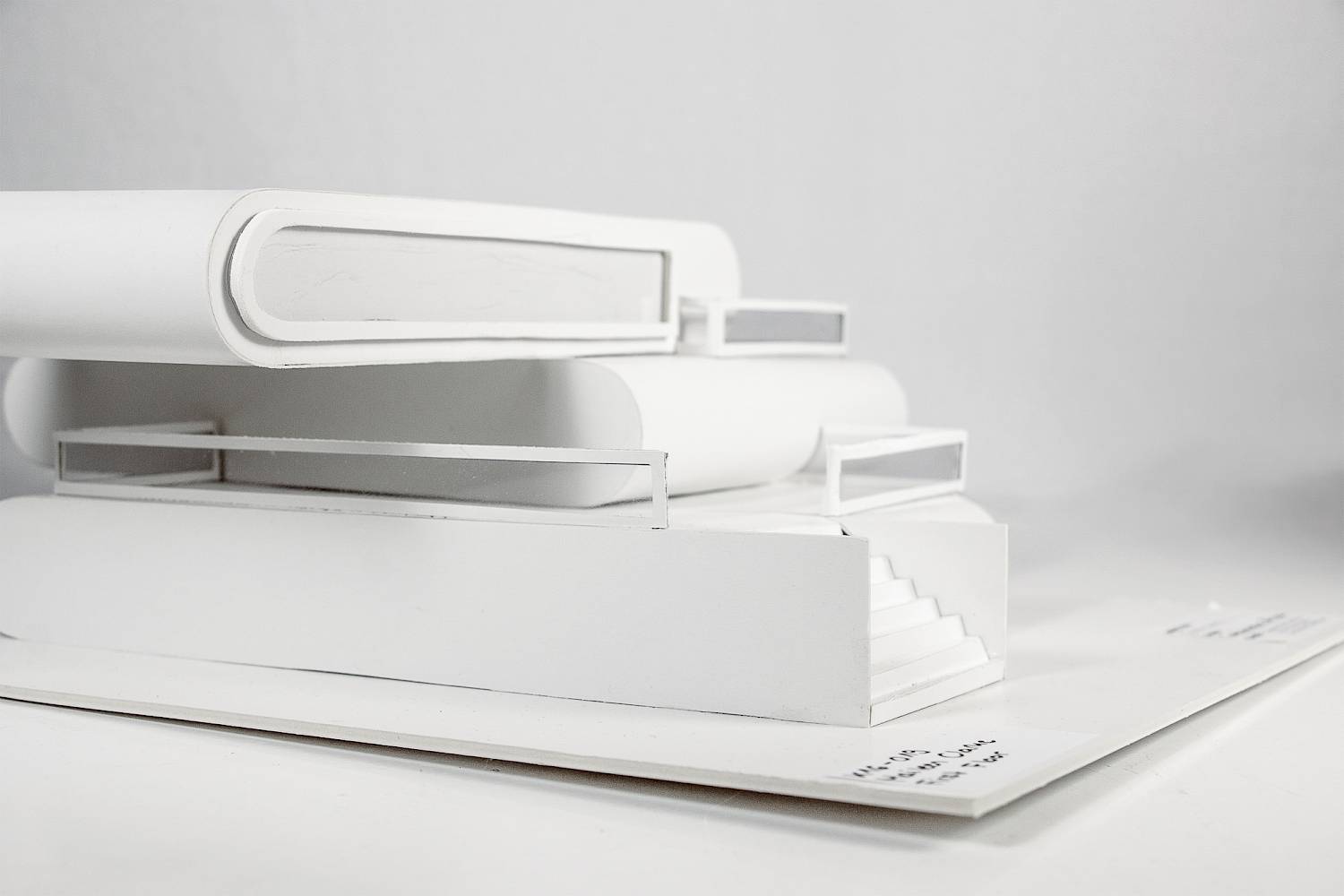 «Das Modell ist von einem Bücherstapel inspiriert: Mehrere längliche Baukörper sind übereinander gestapelt und leicht verschoben, ähnlich wie aufeinander liegende Bücher. Diese Stapelung prägt die Form des Gebäudes und verleiht ihm eine klare Struktur. Durch die versetzte Anordnung entstehen viele Innen- und Aussenräume, die das Gebäude offen und gut zugänglich machen. Die Aussenräume sind öffentlich zugänglich und gratis nutzbar. Dadurch wird das Gebäude nicht nur für Besucher des Opernhauses, sondern auch für die Allgemeinheit zugänglich. Im ersten Stock befindet sich der Eingang zum Opernhaus. In diesem Geschoss sind ausserdem die Umkleiden, Proberäume und weiteren Räume für die Aufführenden untergebracht, die einen reibungslosen Ablauf ermöglichen. Im zweiten Stockwerk liegt ein Restaurant, das sich nach aussen zur Terrasse hin öffnet. Auch diese Terrasse ist gratis zugänglich und Teil des öffentlich nutzbaren Aussenraums. Im dritten Stock befinden sich die Büros und auch sonstige Arbeitsräume die für das Opernhaus verwendet werden müssen. Diese sind eher ruhiger angeordnet und auch optisch Hintergrundelemente des Gebäudes. Auf der rechten Seite des Gebäudes bietet sich ein schöner Ausblick auf den See, der den Innen- und Aussenräumen eine besondere Qualität verleiht. Die Terrassen verstärken die Idee des Bücherstapels.»