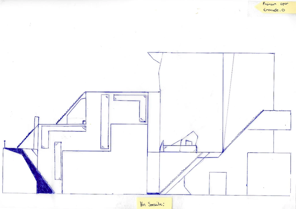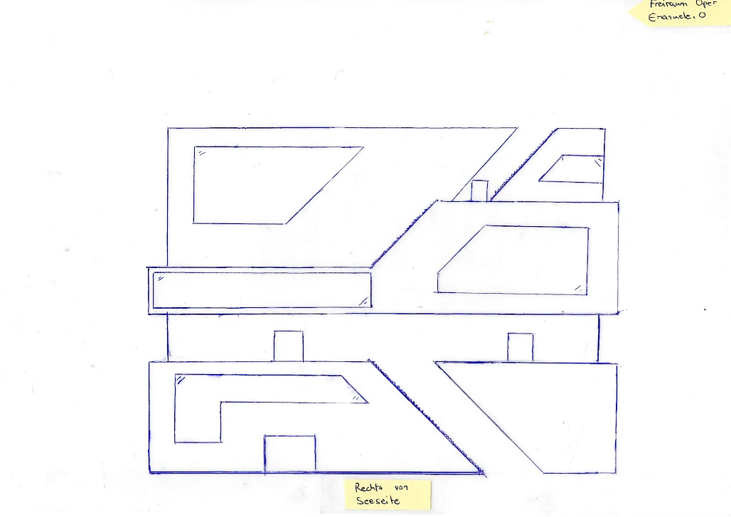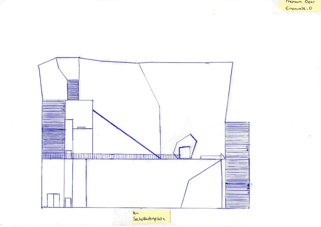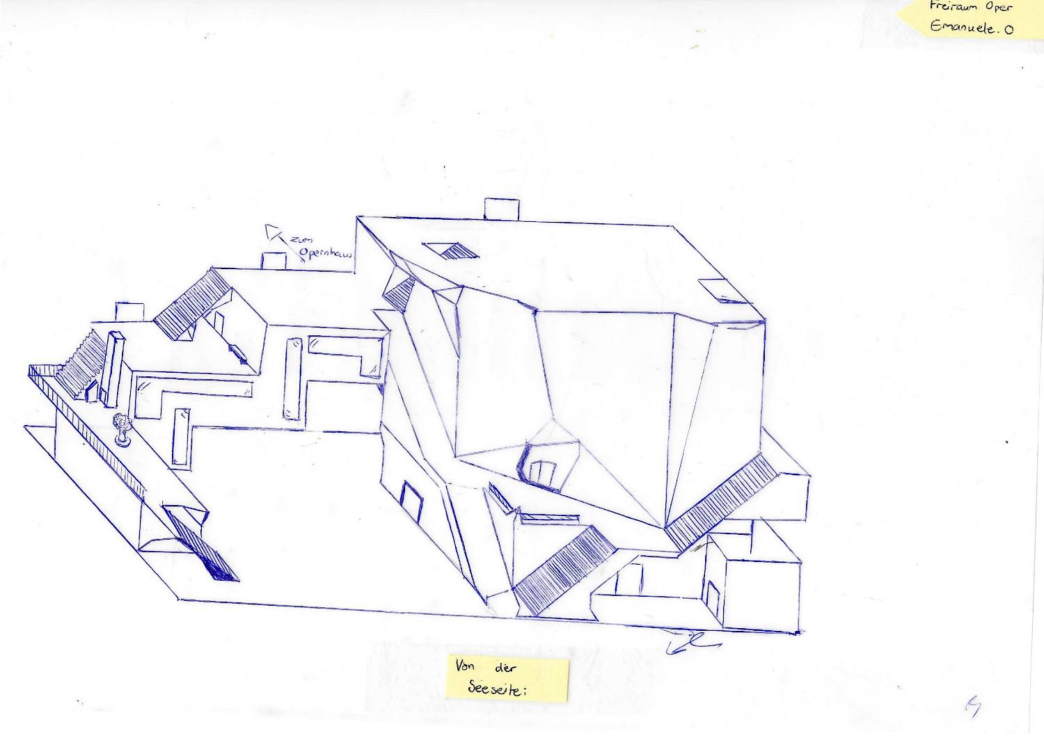 Auf der linken Seite, vom See aus gesehen, wirkt das Gebäude wie eine große Treppe. In dieser Treppenstruktur entstehen Räume, die man zum Mieten nutzen kann. Der offene Platz davor wird viele Sitzmöglichkeiten bieten und die grüne Seite von Zürich zeigen. Ich stelle mir vor, dass viele Pflanzen integriert werden, sodass es ein ruhiger und angenehmer Ort für alle wird. Das Hauptgebäude auf der rechten Seite ist als Arbeitsbereich für die Mitarbeiter des Opernhauses gedacht. Es gibt mehrere Eingänge, die ins Gebäude führen. Insgesamt hat das Gebäude eine eher abstrakte Form mit mehreren Falten, wodurch es besonders und modern wirken soll.»