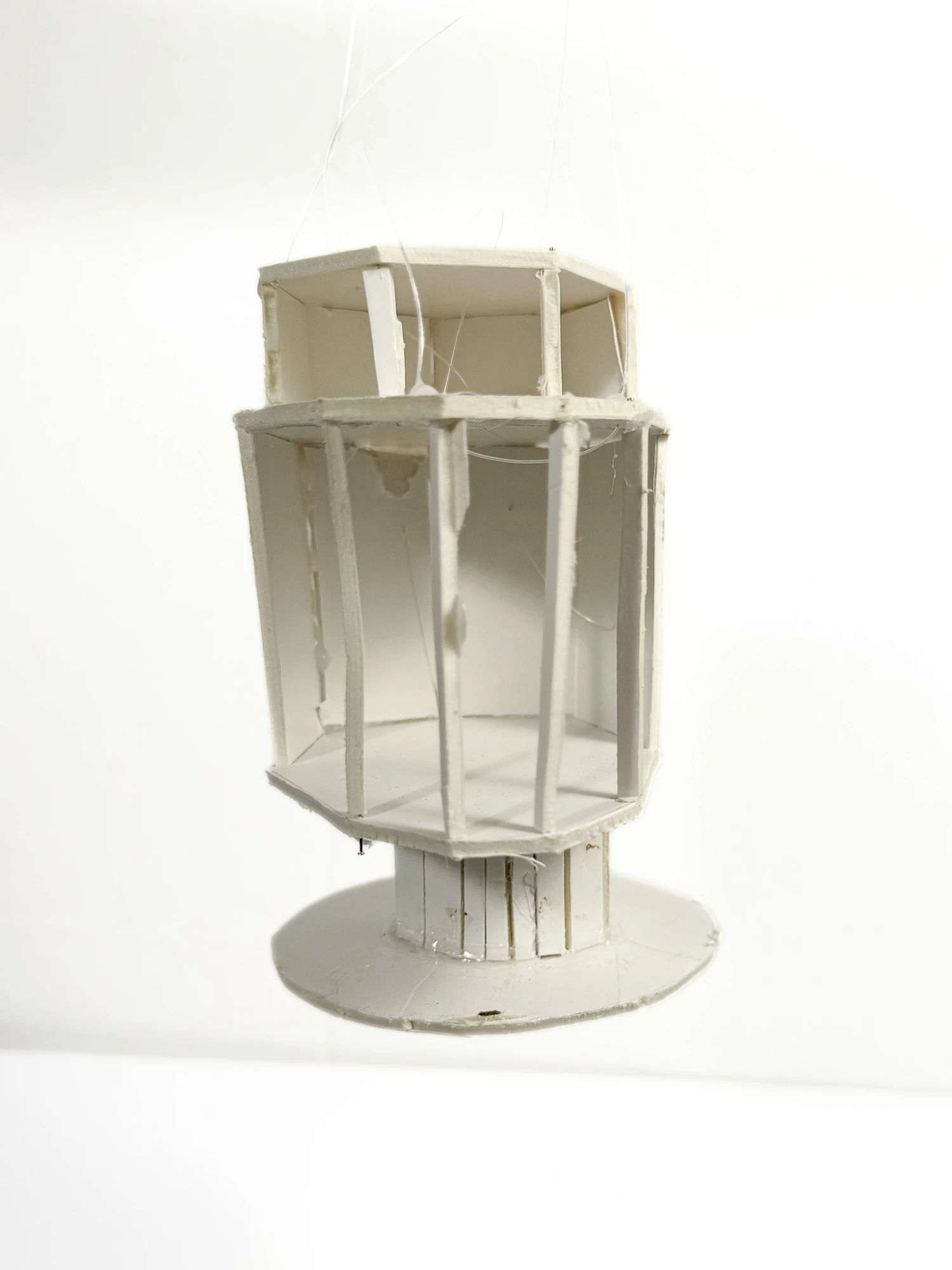 «Mein Modell stellt einen schwebenden Begegnungsraum dar. Es ist in drei Stockwerke aufgeteilt. An der Bahnstation sollen die Gondeln Besucher hoch- und runtergebracht werden. Auf dem 2. Stock soll es Fenster mit drehbaren Lamellen geben, um den Raum zu verdunkeln. Im obersten Stock gibt es eine Bar, und auf dem Balkon gibt es einen eingezeichneten Bereich für Kunst am Bau.»