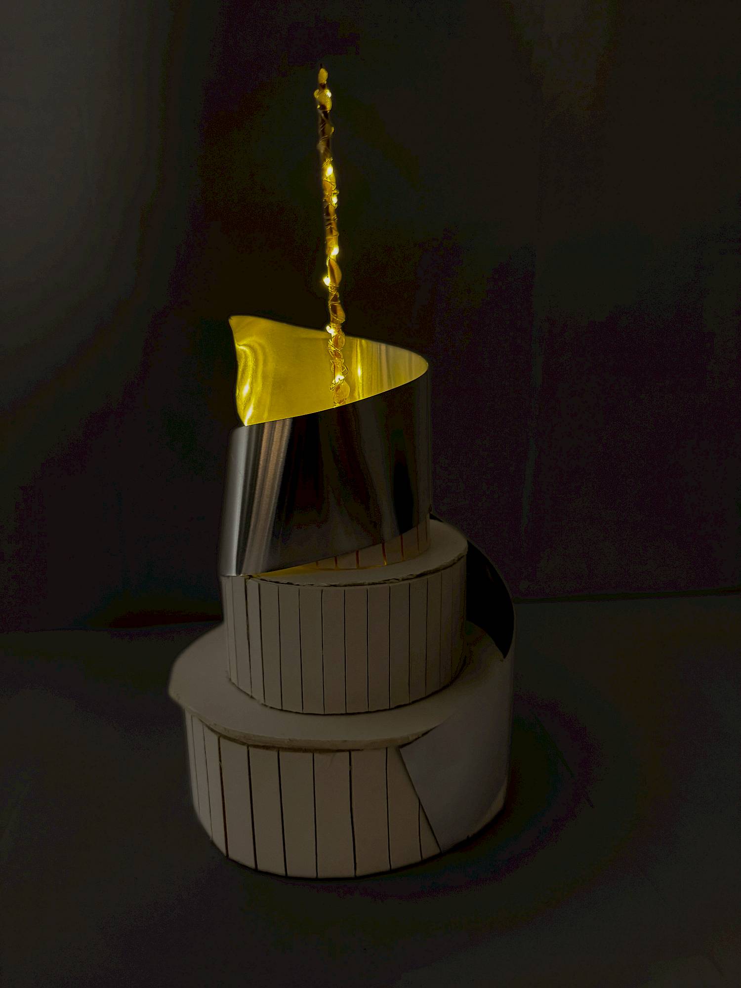 Innen scheint das Modell beleuchtet zu sein, was durch die kleinen vertikalen Öffnungen sichtbar wird. Dadurch wirkt es so, als würde das Gebäude von innen heraus leuchten, fast wie ein Leuchtturm oder ein Kunstobjekt. Oben ragt ein schmaler heller Stab nach oben, der mit einer Lichterkette verziert ist und dem Modell einen starken Mittelpunkt gibt.»