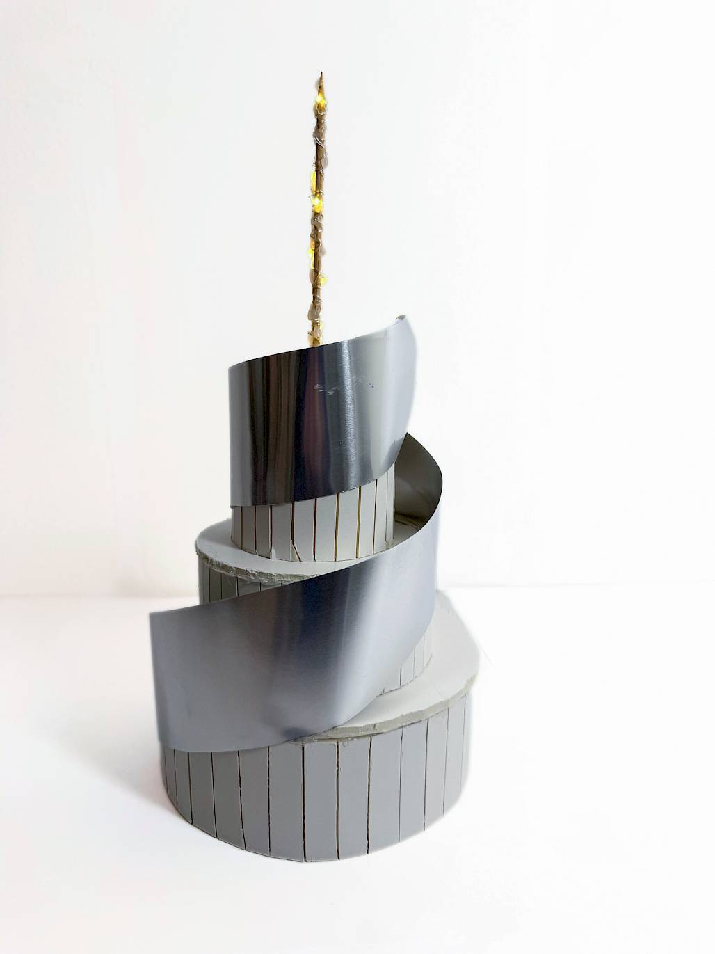 «Das Modell sieht aus wie ein moderner Turm, der sich spiralförmig nach oben dreht. Es besteht aus mehreren runden Ebenen, die übereinandergestapelt sind, aber nicht gerade, sondern leicht verdreht, sodass alles dynamisch wirkt. Um die Ebenen legt sich ein silbernes Band, das sich wie eine Spirale nach oben zieht und dem Gebäude Bewegung gibt.