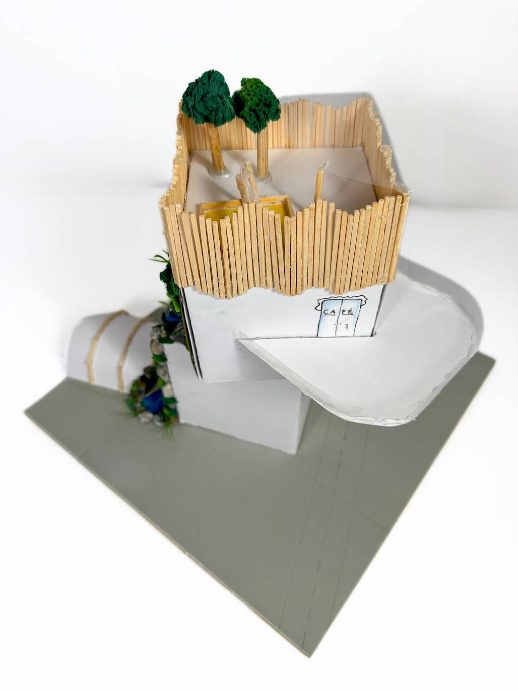 «Ein Beachvolleyballfeld wollten wir auf dem Dach haben, das öffentlich zugänglich ist, ausserdem hat es Bäume, eine überdachte Sitzecke mit Tischchen und eine Lounge. Mit einer Treppe und einem Lift, der im Gebäude selbst hoch geht, kommt man zu dieser Dachterrasse. Sie ist mit Holzbalken umzäunt, die genügend hoch sind, damit der Ball nicht runterfallen kann. Die Balken haben jedoch 80 kleine Gucklöcher, um die Aussicht auf den Zürichsee oder auf den Sechseläutenplatz zu sehen.