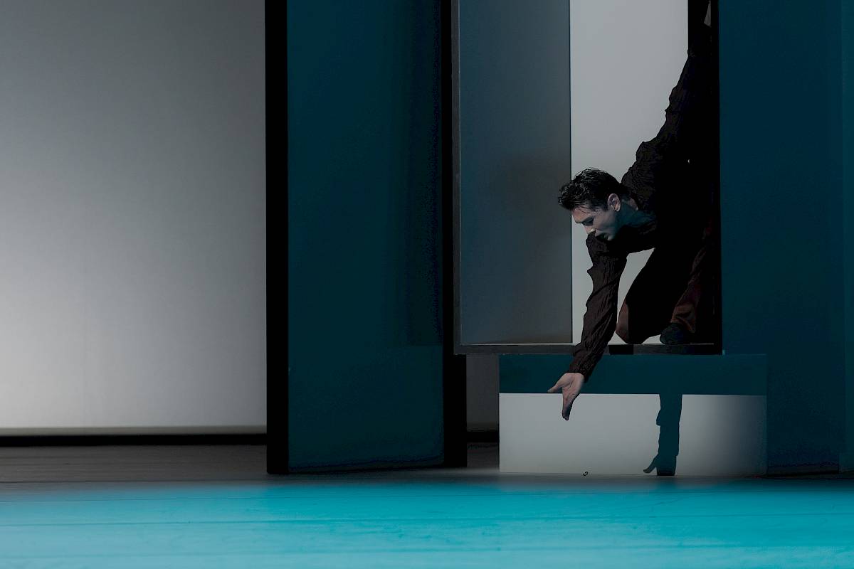 Zum Glück darf ich eine choreografische Antwort geben und muss nicht behaupten, dass sie Händchen gehalten oder nackt nebeneinander gelegen hätten. Darum geht es auch nicht. Die siebente Clara – ich nenne sie die Muse – hat eine Geste, bei der sie ihre Hand an ihr Gesicht hält. Es ist wie eine Art Mauer mit Robert auf der einen und Brahms auf der anderen Seite, und sie scheint die Sicht auf Robert in der Endenicher Nervenheilanstalt zu versperren. Eine unsichtbare Grenze, wobei ich damit spielen kann, wann und wie diese Linie überschritten wird. Clara nimmt Brahms’ Unterstützung während Roberts Endenicher Asyl und nach seinem Tod an. Aber wenn man das weiterdenkt, kommt man irgendwann in den Bereich der Vermutung und Spekulation. Der Tanz kann diese fliessende Grenze bewahren.