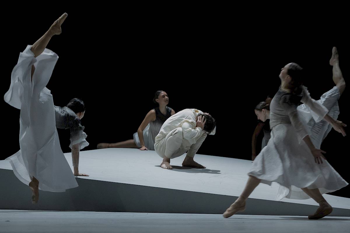 Als Pianistin für unsere Ballettproduktion konnten wir die grosse Clara-Schumann-Spezialistin Ragna Schirmer gewinnen. Ragnas Klavierpart zieht sich wie ein roter Faden durch das Stück. Sie gibt den sieben Claras eine Stimme und steht der zentralen Tanzrolle Robert Schumanns gegenüber. Darüber hinaus ist das Klavier nicht nur im Bühnenbild, sondern auch in den Kostümen allgegenwärtig. Mit unserem Bühnenraum für Clara wollten wir eine Klavierwelt evozieren, in der das Instrument präsent ist, auch wenn man es nicht sieht. Ähnlich wie im Ballett The Cellist, wo Hildegard Bechtler das Innenleben des Cellos zu einer Echokammer, einem Gedächtnisraum entwickelt hat, haben wir jetzt eine Szenerie, die uns in die Welt des Klaviers eintauchen lässt – die rechtwinklige Welt von sieben Tasten, die klar geschnittenen Öffnungen, der geschwungene Korpus, der an den Flügel eines Vogels oder eines Engels denken lässt. Auf einem stilisierten Flügeldeckel entsteht eine inselartige Spielfläche. Es ist der Rückzugsort, an dem die Hochzeit von Robert und Clara stattfindet, aber auch das Symbol für Roberts Jahre in der Endenicher Heilanstalt. Das Bühnenbild verbindet sich mit einer äusserst vielgestaltigen, gefalteten Welt in den Kostümen Bregje van Balens, die ihren Ursprung in Robert Schumanns Klavierpartituren haben.