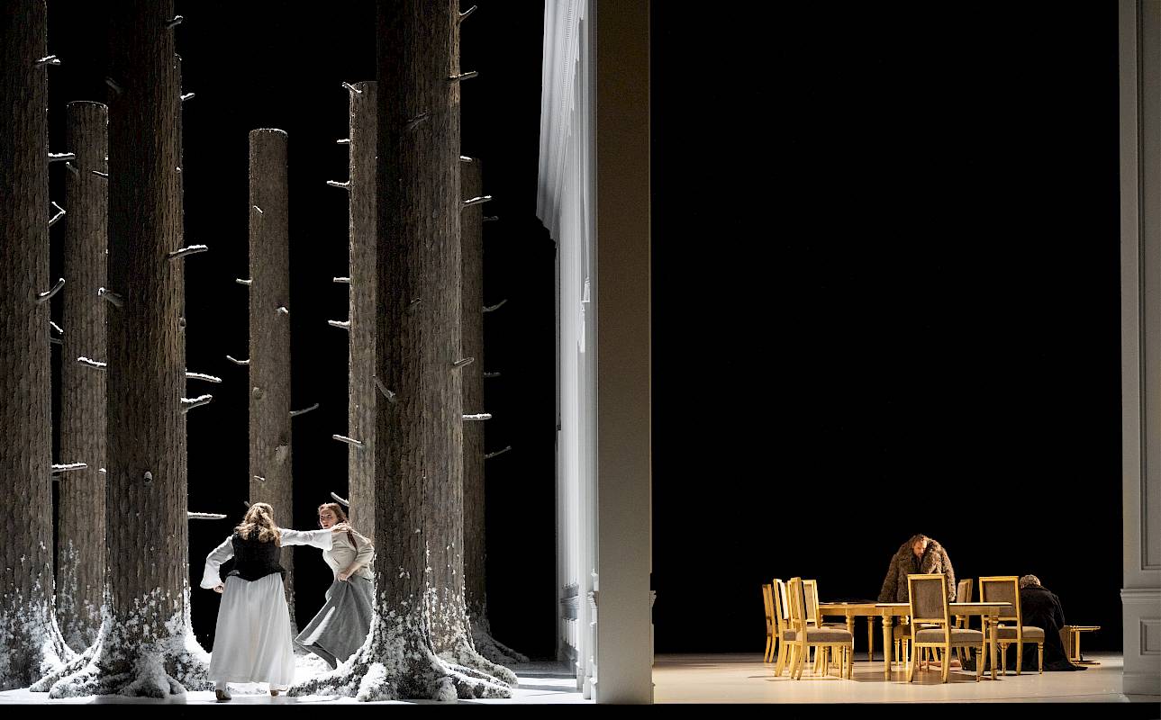 Sie wundern sich jetzt wahrscheinlich darüber, dass ich über solch eine technische Banalität schreibe, und warten darauf, dass ich erwähne, dass Bäume, Felsen, Tische etc. tonnenschwer sind und mittels ausgefeiltester Raffinesse hinten leise von der Drehscheibe geschoben werden, während vorne auf der Bühne grade eine Arie hingehaucht wird. Genauso ist es zwar (lediglich am «leise» arbeiten wir grad noch, da haben die Bühnentechnik und der Regisseur noch unterschiedliche Auffassungen darüber, was «leise» bedeutet), aber um diese Raffinesse geht es nicht: Der wirkliche Bühnenzauber besteht darin, dass sich zum Ende des ersten Akts die Wände des Bühnenbildes plötzlich in der Mitte öffnen: Das Kreuz auf der Bühne teilt sich, die beiden Wände links und rechts schwingen wie Türflügel auf und geben den Blick auf die Hinterbühne frei, auf der die Baumstämme stehen und es schneit.
