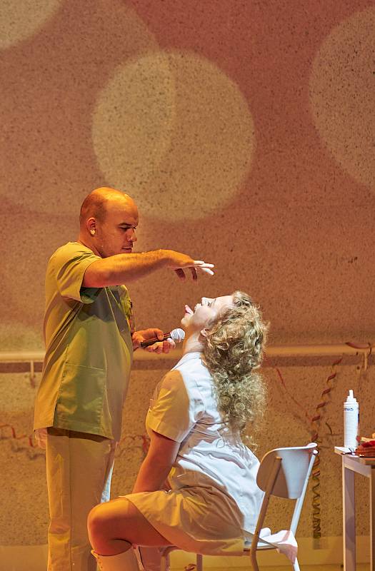 Auf der Probebühne steht nun ein Raum in klinischem Weiss, in dem auf ebenso weissen Stühlen und Sesseln nicht nur Sängerinnen und Sänger des Internationalen Opernstudios, sondern auch ältere Mitglieder des Statistenvereins zu sehen sind. Bonafede schiebt zu Beginn der Inszenierung einen Rollator vor sich her. Sie spielt dort, wo der Alte heute vermutlich anzutreffen wäre: im Pflegeheim für Betagte. Bonafedes Töchter gehen hier ein und aus, wenn sie ihren Vater besuchen. Ecclitico ist ein umtriebiger Pfleger mit Zugang zum Medikamentenschrank. Auch Ernesto, Cecco und Lisetta arbeiten im Pflegeheim. Nur ein runder Himmelskörper in Globus-Form erinnert daran, dass es in diesem Stück eigentlich um den Mond gehen soll. Statt auf den Mond wird Bonafede im zweiten Akt dieser Inszenierung zurück in seine Jugend geführt – und diese Interpretation ist nicht einmal weit hergeholt, denn in den 60er-Jahren, die hier als Gegenwelt heraufbeschworen werden, landete Neil Armstrong bekanntlich erstmals auf dem wirklichen Mond. Viel wichtiger ist aber, dass sowohl Bonafede als auch die drei jungen Paare in dieser Oper eine Welt der freien Liebe herbeisehnen – Bonafede, weil er gerne frei über alle Frauen verfügen will, und die jungen Menschen, weil sie ohne fremden Zwang entscheiden wollen, wen sie lieben. Die Handlung der Oper, in der ursprünglich auch das im 18. Jahrhundert brisante Thema der Vernunftheirat kritisiert wird, lässt sich also leicht in die Jahre der Hippie-Bewegung übertragen, in der die Ehe erneut stark hinterfragt wurde. Rund um die Probebühne verteilt, liegen deshalb schon haufenweise bunte Batik-Tücher, Regenbogengirlanden, und Glitter bereit, die Bonafedes Pflegeheim in die Welt seiner Jugend verwandeln sollen. Das Pflegepersonal wird ihm in diesen Szenen im Hippie, Guru und Rockabilly-Look begegnen und für einmal lustvoll die geltenden Hierarchien umdrehen.