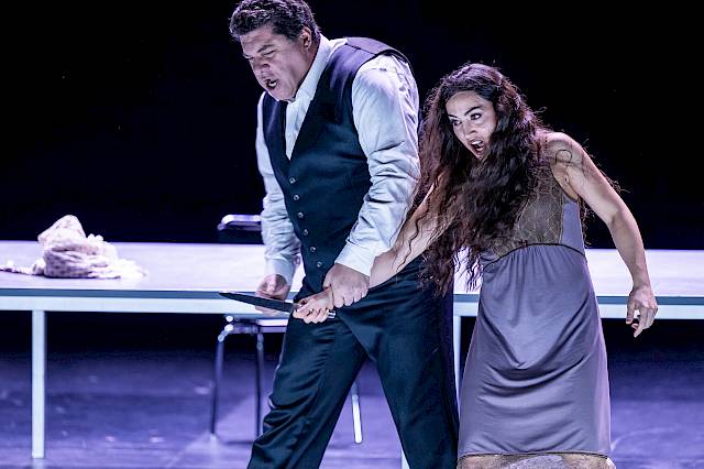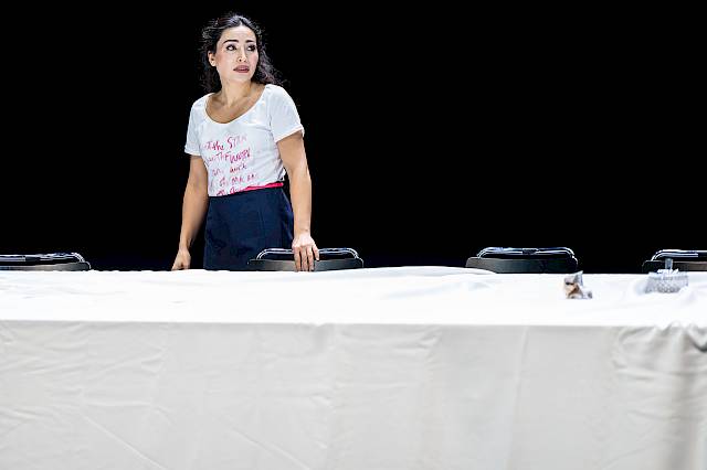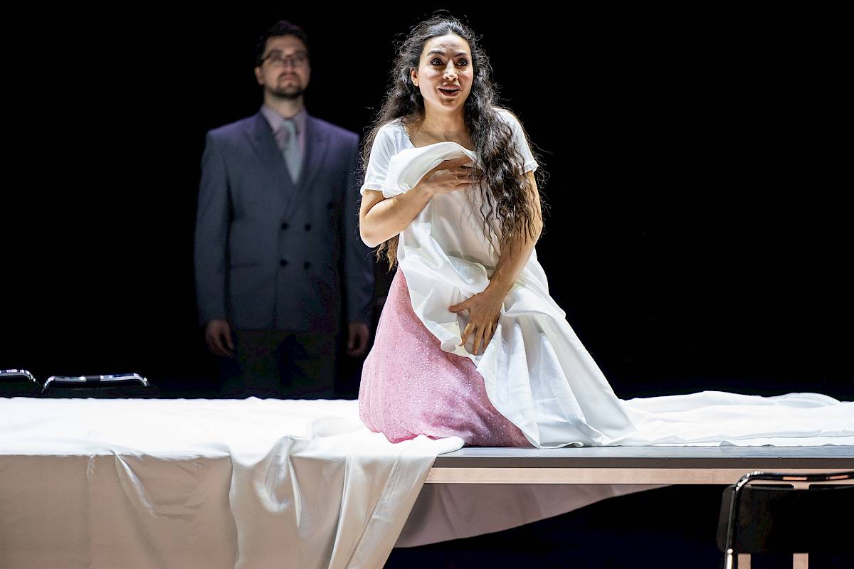 Eine Riesenentwicklung. Sie ist ja zu Beginn fast wie Parsifal, eine unwissende, entfernt von der Welt lebende und von allem abgeschottete junge Frau. Ein Mädchen an der Schwelle zum Erwachsensein. Man spürt die Pubertät. Sie kommt in ein Alter, in dem der Vater und Giovanna ihr nicht mehr ausreichen. Sie spürt, dass es noch etwas anderes geben muss als ihre enge Welt. Sie will raus, mehr sehen, mehr erleben. Und dann erlebt sie ihre allererste grosse Liebe. Das ist ein riesiger Schritt. Und jede Erfahrung macht sie erwachsener: die Entführung, die Nacht mit dem Herzog, die Entscheidung, sich gegen die Rachegedanken ihres Vaters zu stellen, bis hin zu dem unglaublichen Akt, mit dem sie sich opfert. Sie bringt damit ja nicht nur eine private Geschichte zu Ende, sondern wirft sich dem ganzen perfiden, korrupten System entgegen. Es ist fast schon Jesus Christus, wenn sie sagt: Ich sterbe für euch alle und für den, der mir am meisten angetan hat. Musikalisch fällt auf, dass sie es in der Nähe ihres Vaters nie schafft, einen Bogen auszusingen. Der Vater unterbricht sie ständig und würgt sie ab. Erst ganz am Ende, wenn sie eigentlich schon tot ist, schafft sie es, lange Bögen zu singen. Plötzlich wird ihr Gesang schwebend und frei und gross und atmet. Man hat das Gefühl, dass sie zum ersten Mal den Raum bekommt, alles das zu sagen, was sie sagen will.