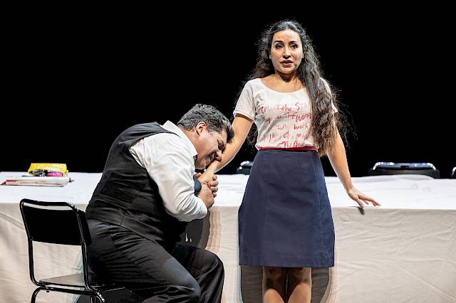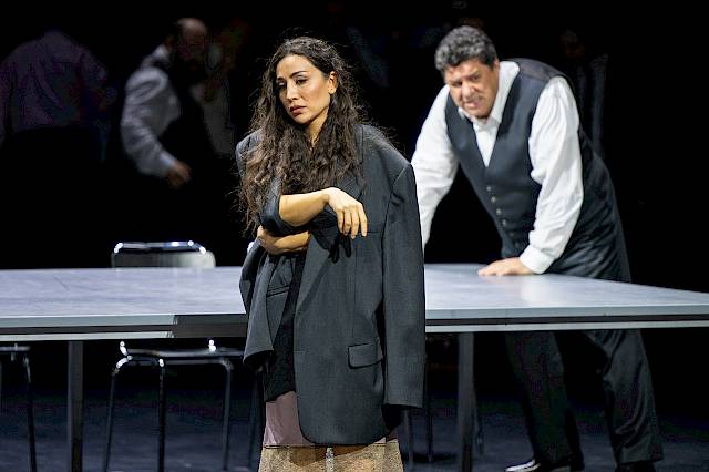 Als Objekt und Opfer! Die Frauen stehen in Rigoletto am untersten Ende der gesellschaftlichen Hackordnung. Die Gräfin Ceprano wird nur gebraucht, um dem Ehemann Schaden zufügen zu können. Denn die Männer setzen mit ihren Demütigungen am empfindlichsten Punkt an, den es in ihrem Leben gibt, das sind ihre Frauen und Töchter. Sie werden entehrt. Der Herzog singt in seiner Ballata, dass er jede Frau haben kann, und es erscheint die Gräfin Ceprano. Sie will gleich wieder weg, mit offenkundig guten Gründen. Es ist spannend zu beobachten, wie hintergündig Verdi solche Momente auch musikalisch anlegt, wenn er etwa auf jedem Akkord einer Bandamusik Akzente wie kleine aggressive Stiche notiert oder in den Tänzen plötzlich einen ironischen Unterton mitklingen lässt. Beim Auftritt der Gräfin Ceprano entsteht im Perigordino-Tanz plötzlich eine unangenehme Intimität innerhalb einer öffentlichen Situation.